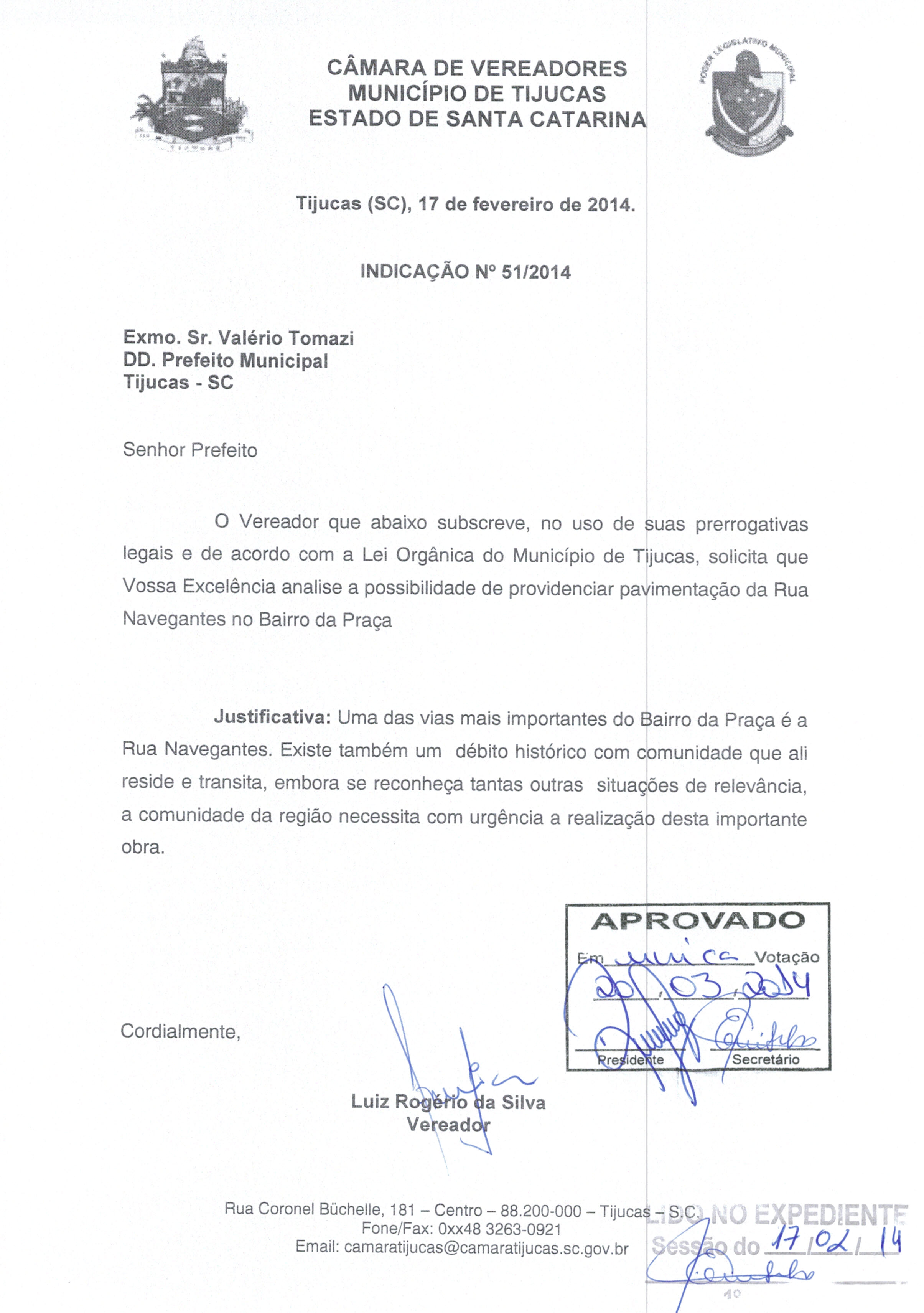 | IND. Nº 51/2014 APROVADA | Avulso | 20/03/2014 | LUIZ ROGÉRIO DA SILVA | 1729.jpeg |