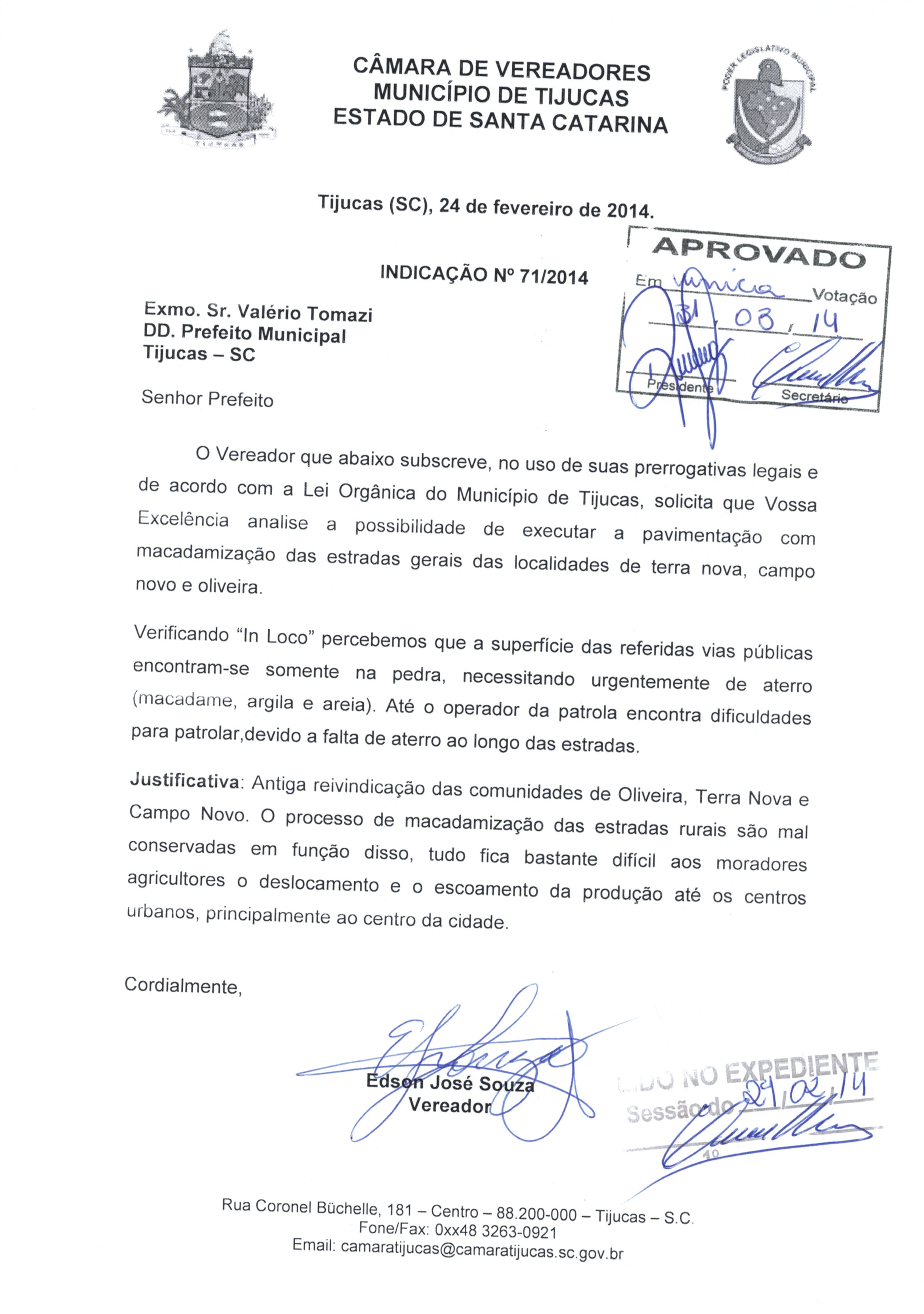 | IND. Nº 71/2014 APROVADA | Avulso | 31/03/2014 | EDSON JOSÉ DE SOUZA | 1791.jpeg |