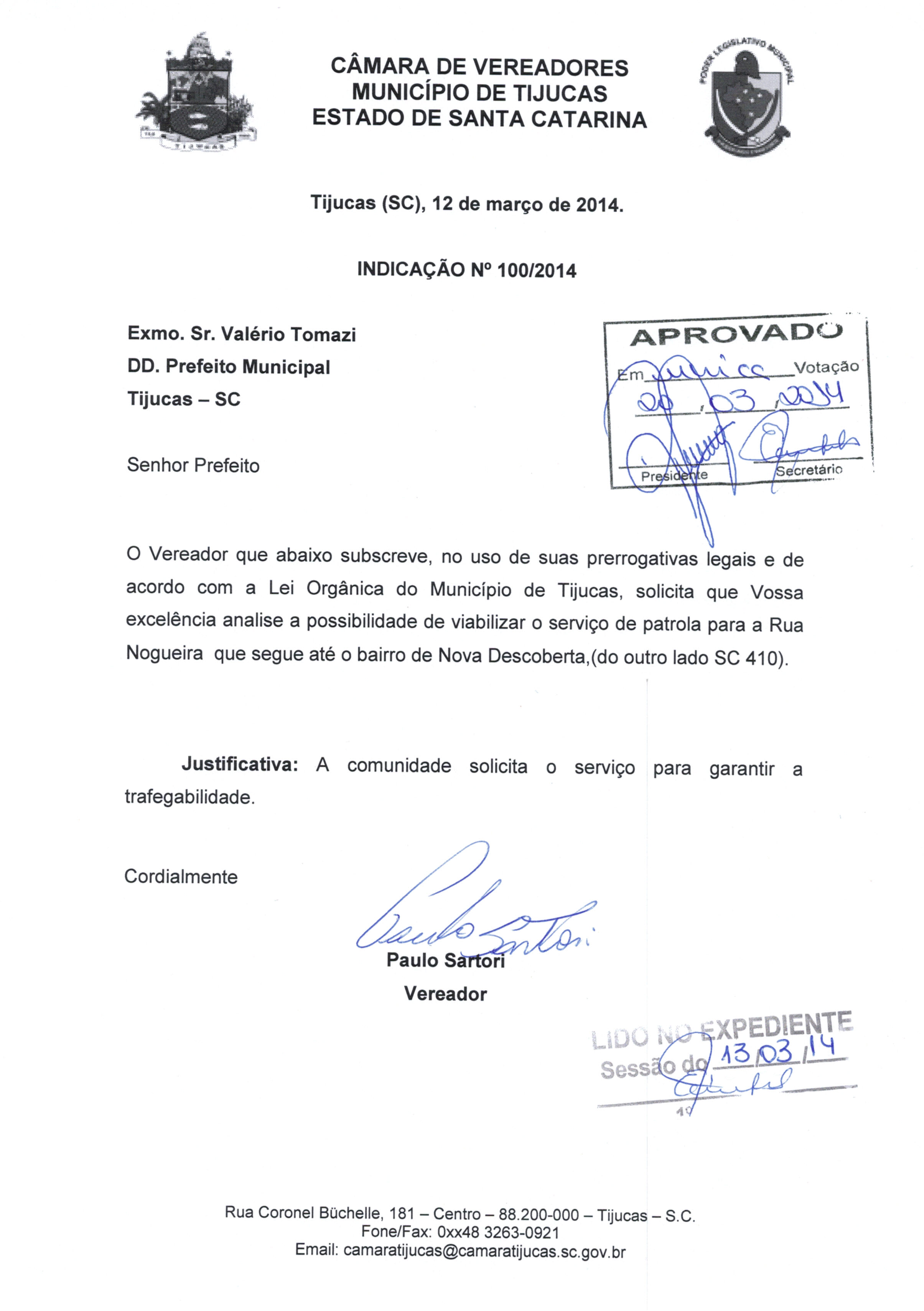 | IND. Nº 100/2014 APROVADA | Avulso | 20/03/2014 | PAULO SARTORI | 1725.jpeg |