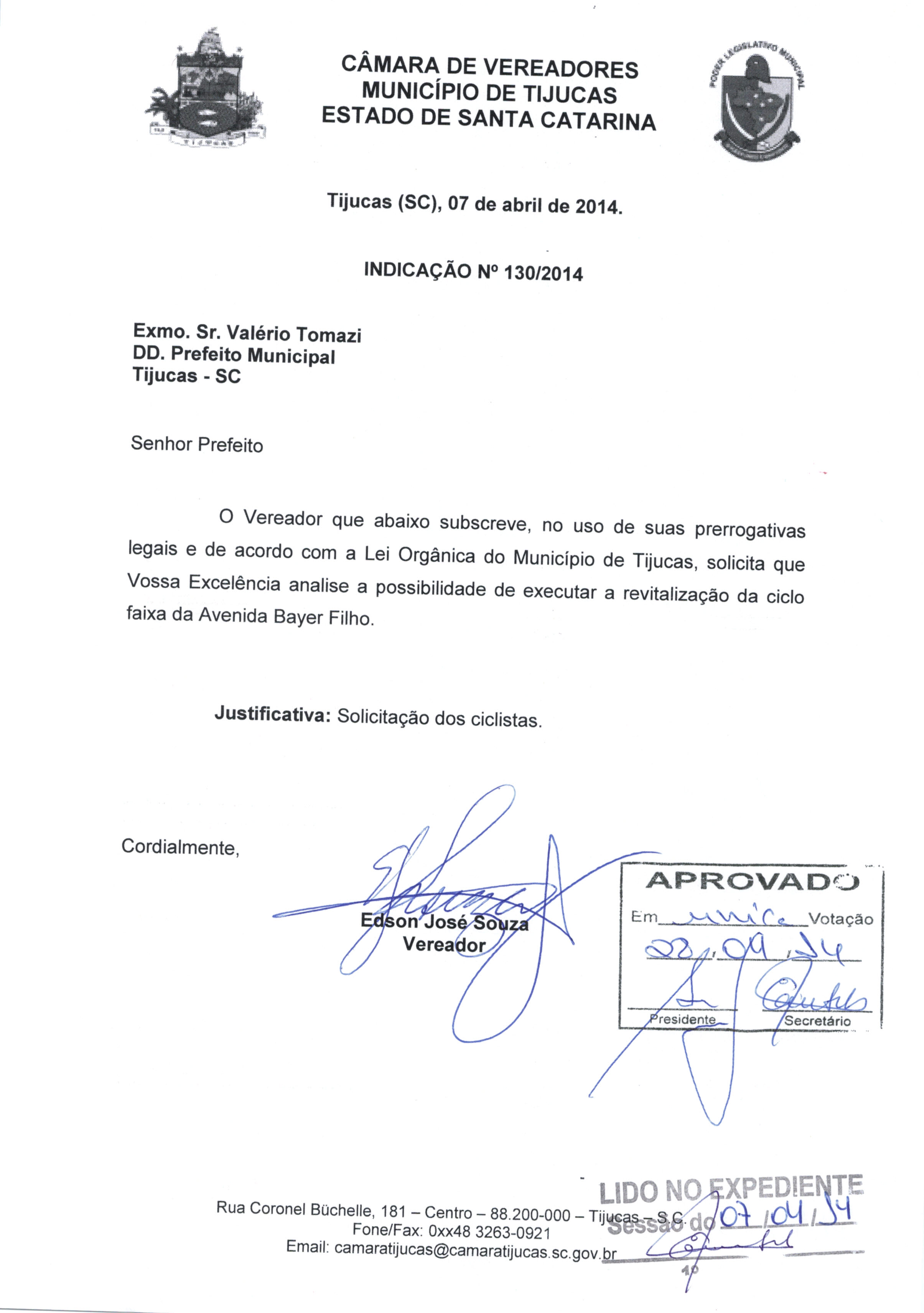 | IND. Nº 130/2014 APROVADA | Avulso | 28/04/2014 | EDSON JOSÉ DE SOUZA | 1967.jpeg |