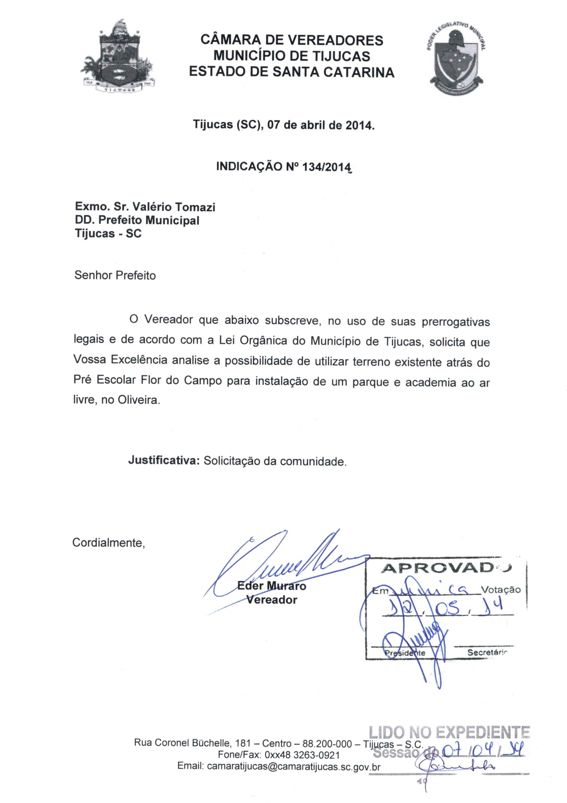 | IND. Nº 134/2014 APROVADA | Avulso | 12/05/2014 | EDER MURARO | 2032.jpeg |