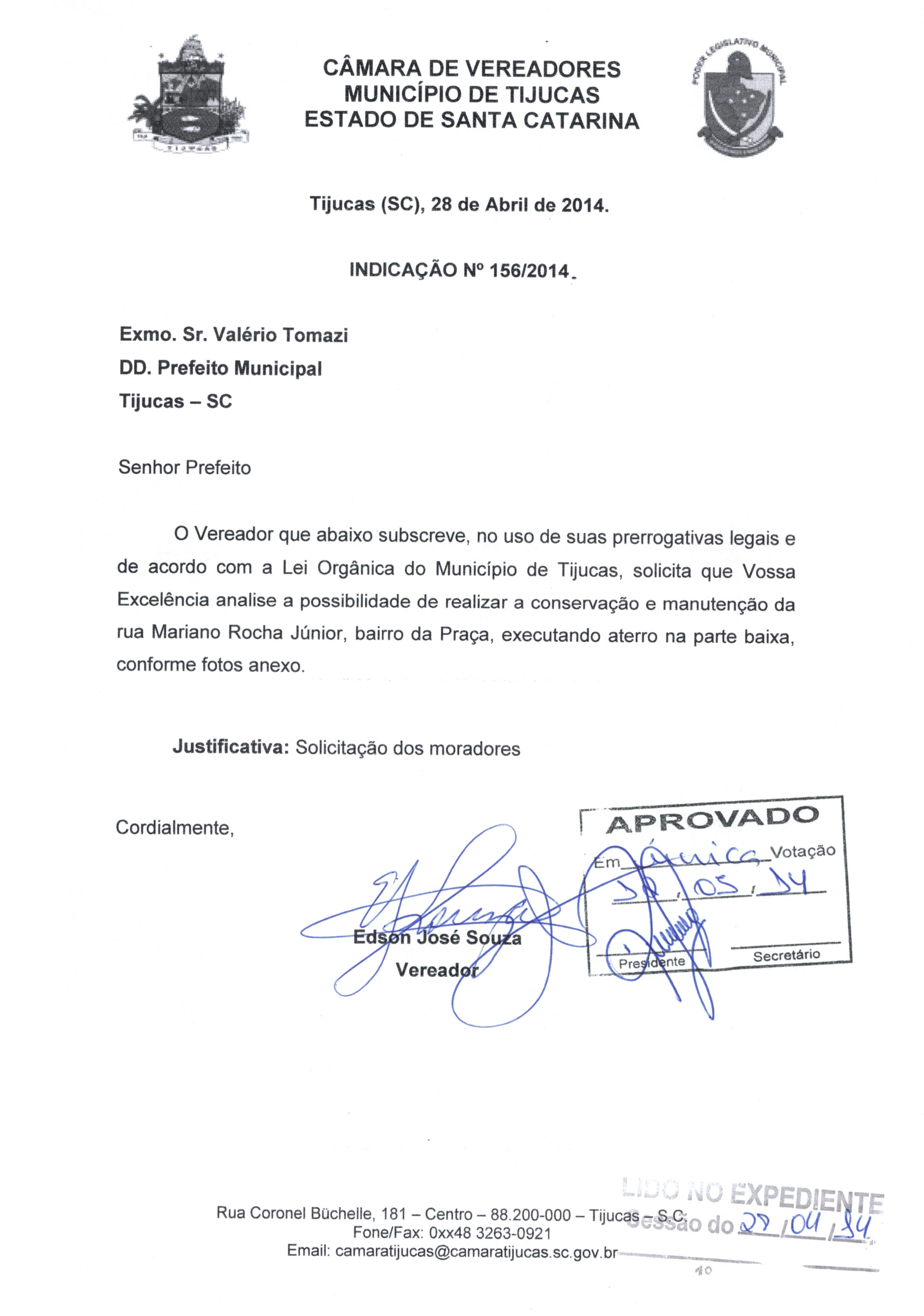 | IND. Nº 156/2014 APROVADA | Avulso | 12/05/2014 | EDSON JOSÉ SOUZA | 2040.jpeg |