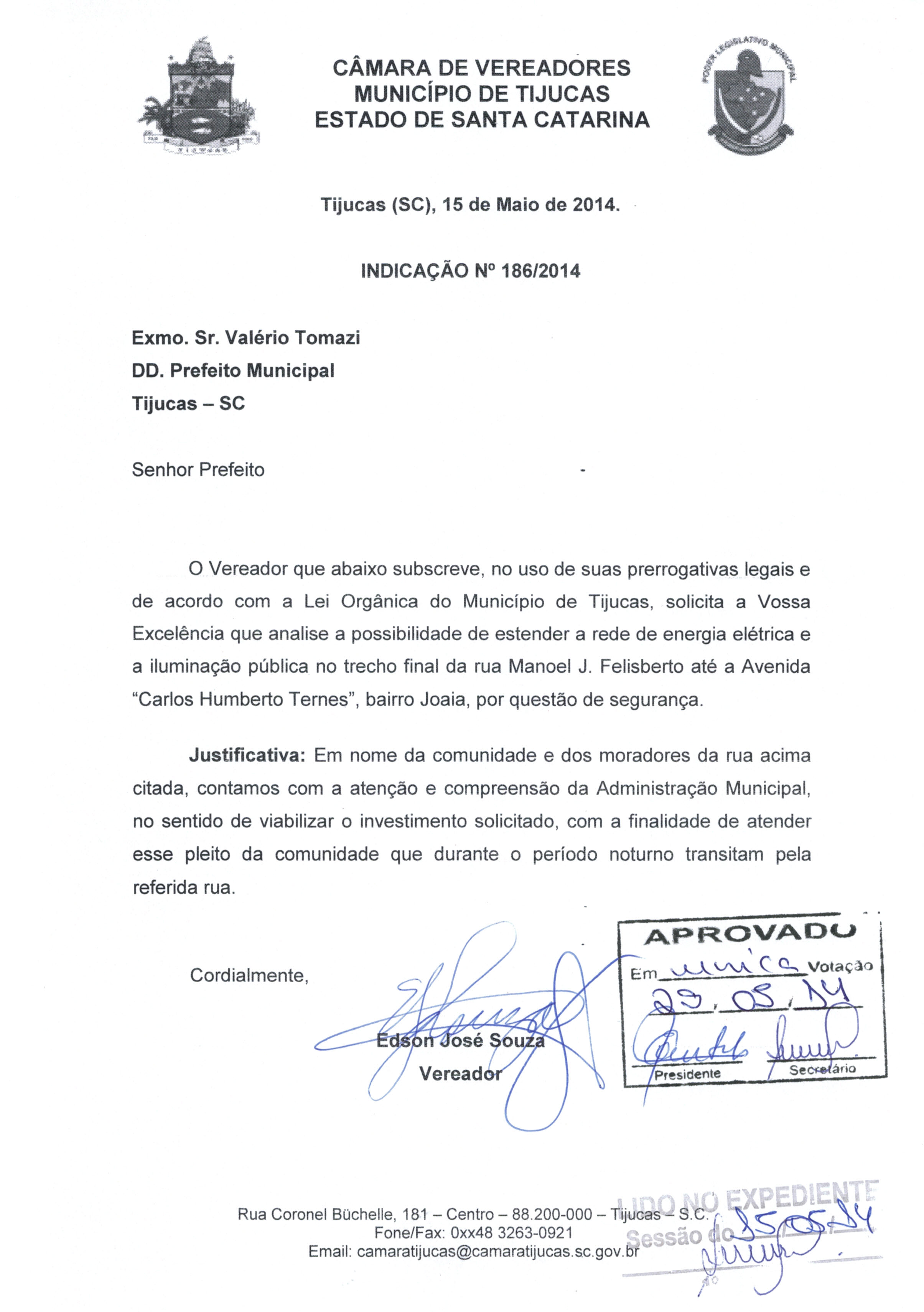 | IND. Nº 186/2014 APROVADA | Avulso | 29/05/2014 | EDSON JOSÉ SOUZA | 2183.jpeg |