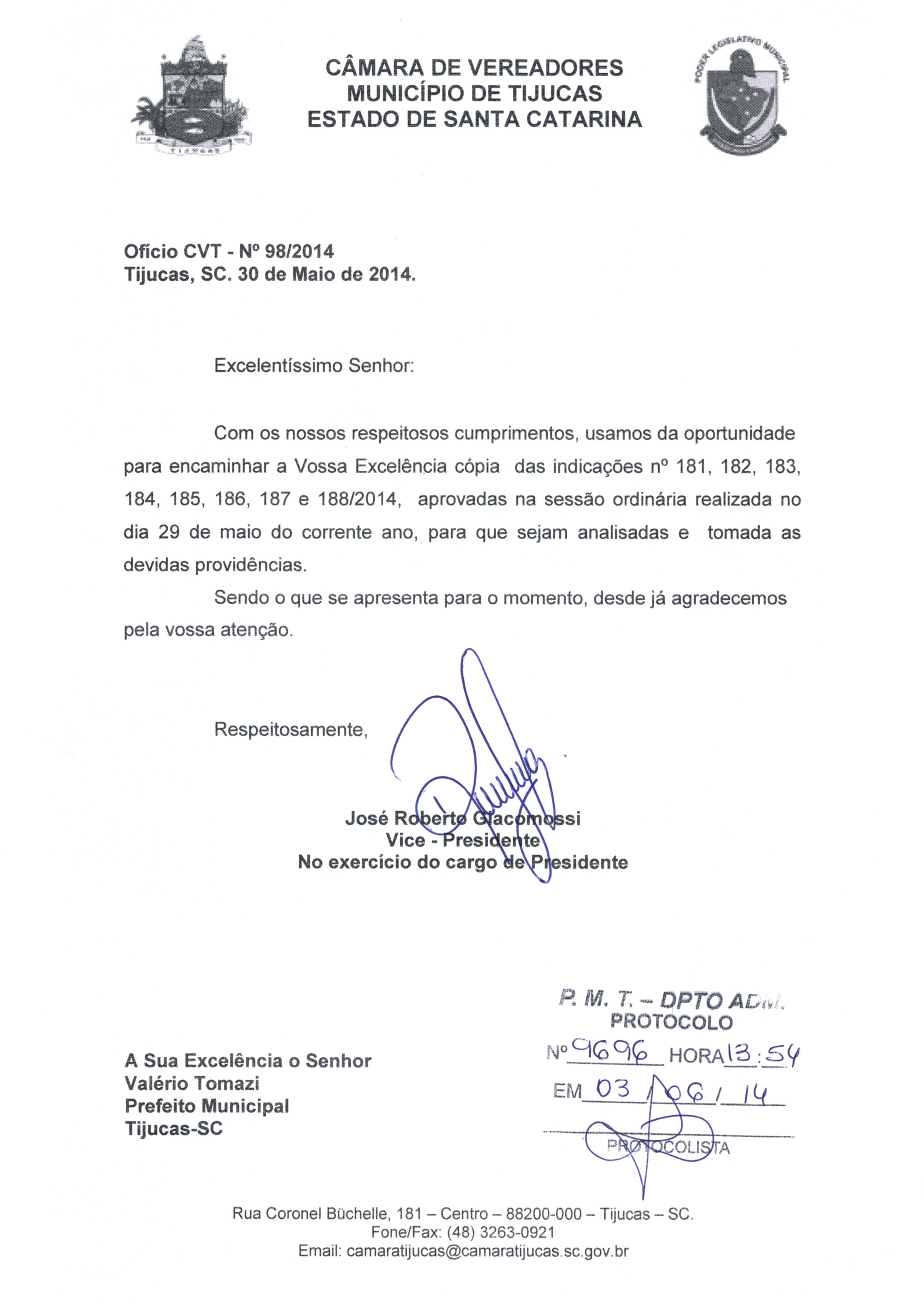 | OFÍCIO CVT Nº 98/2014 | Ofício | 03/06/2014 | JOSÉ ROBERTO GIACOMOSSI | 2202.jpeg |