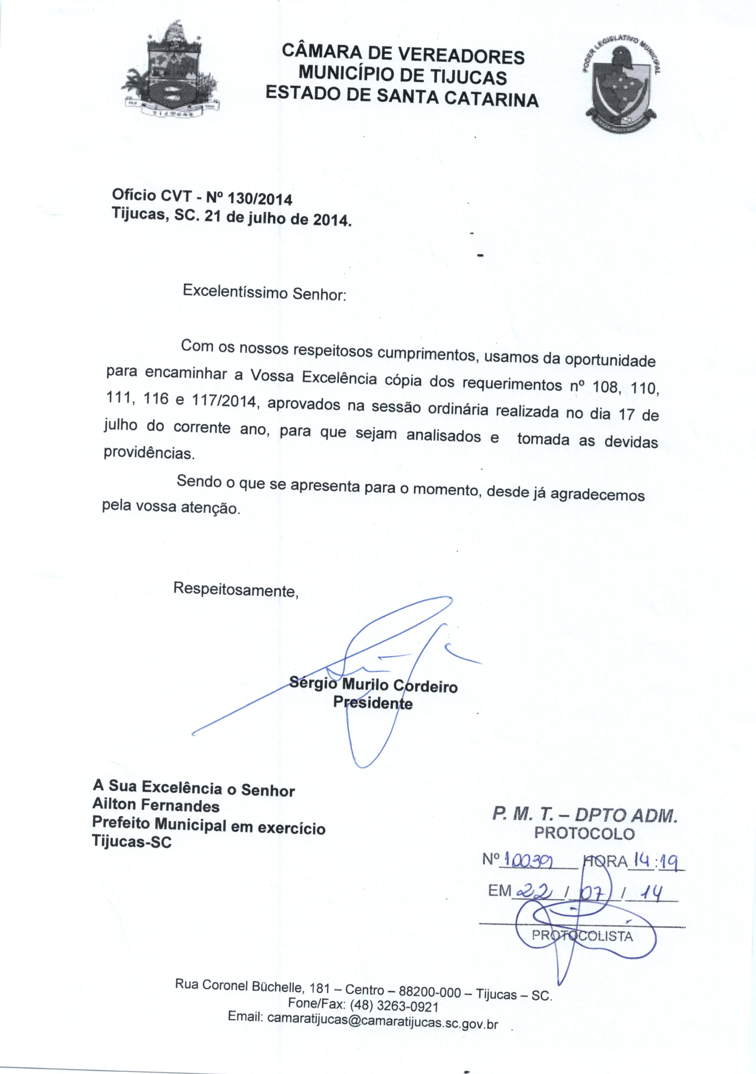 | OFÍCIO CVT Nº 130/2014 | Ofício | 22/07/2014 | SERGIO MURILO CORDEIRO | 2415.jpeg |