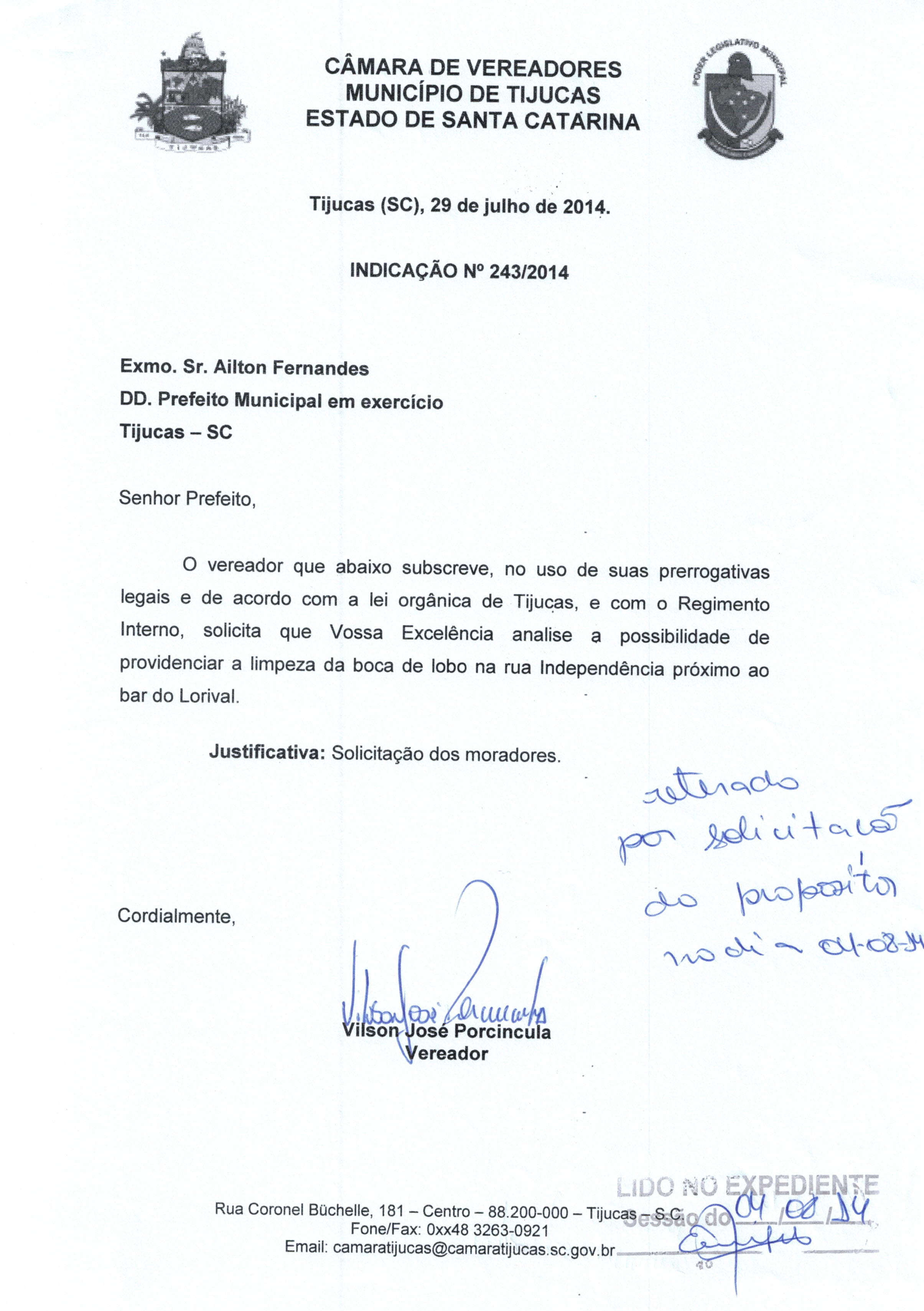 | IND. Nº 243/2014 RETIRADO | Avulso | 04/08/2014 | VILSON JOSÉ PORCÍNCULA | 2494.jpeg |
