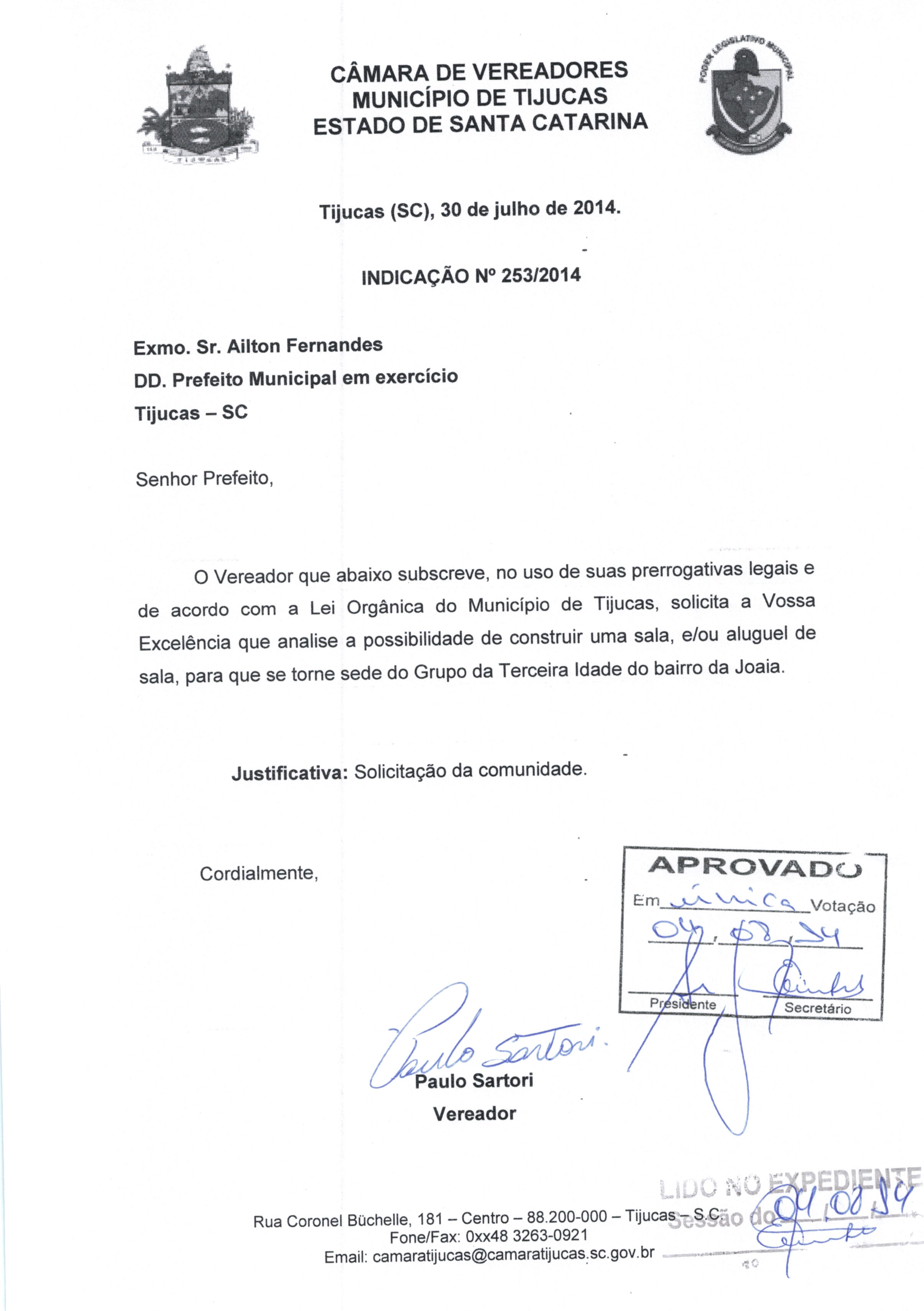 | IND. Nº 253/2014 APROVADA | Avulso | 04/08/2014 | PAULO SARTORI | 2503.jpeg |