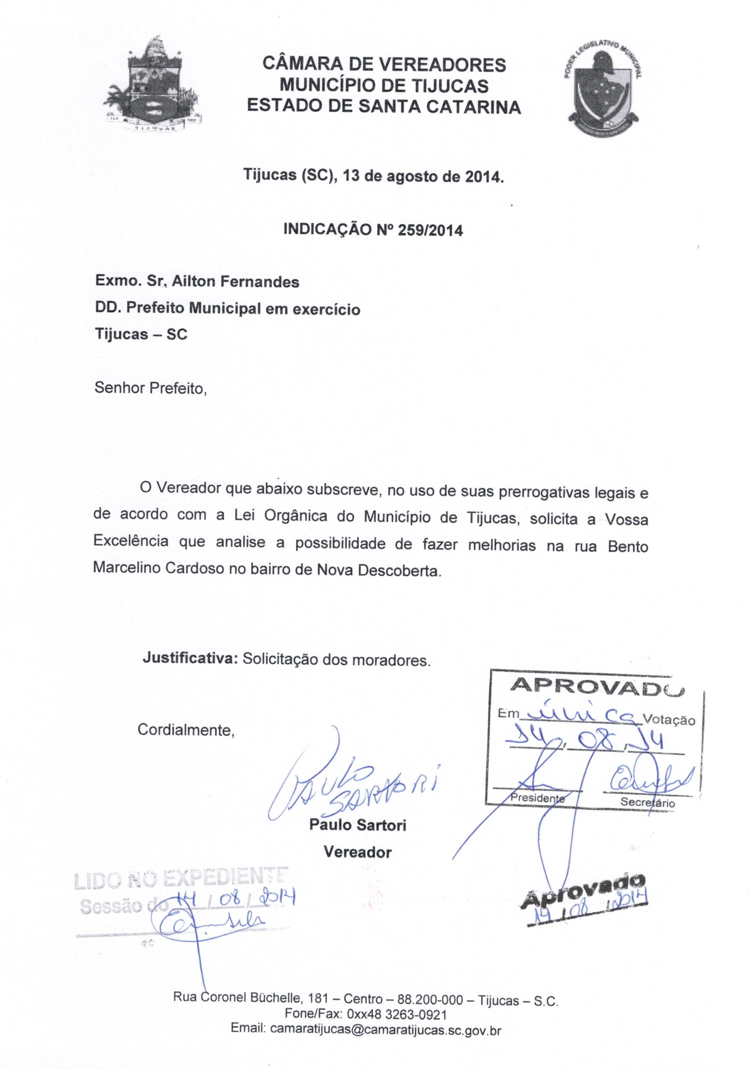 | IND. Nº 259/2014 APROVADA | Avulso | 14/08/2014 | PAULO SARTORI | 2603.jpeg |