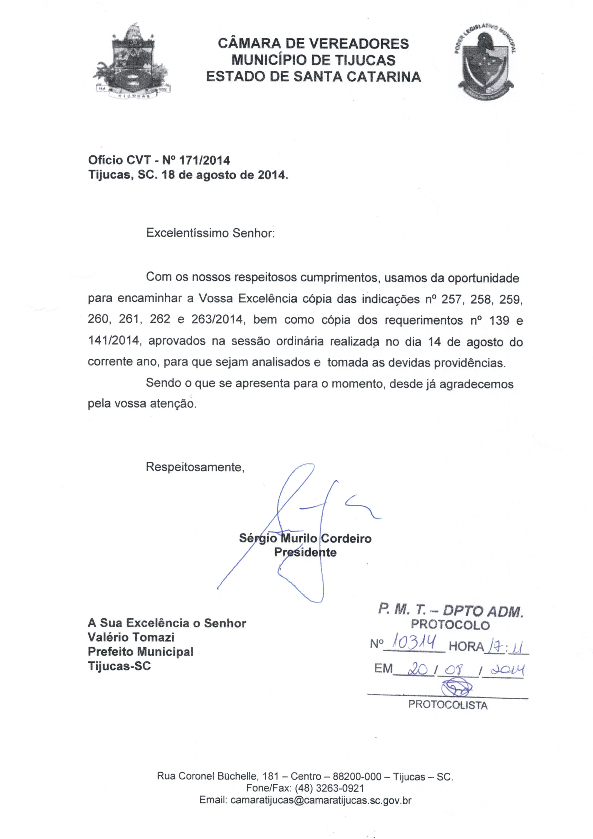 | OFÍCIO CVT Nº 171/2014 | Ofício | 20/08/2014 | SERGIO MURILO CORDEIRO | 2622.jpeg |