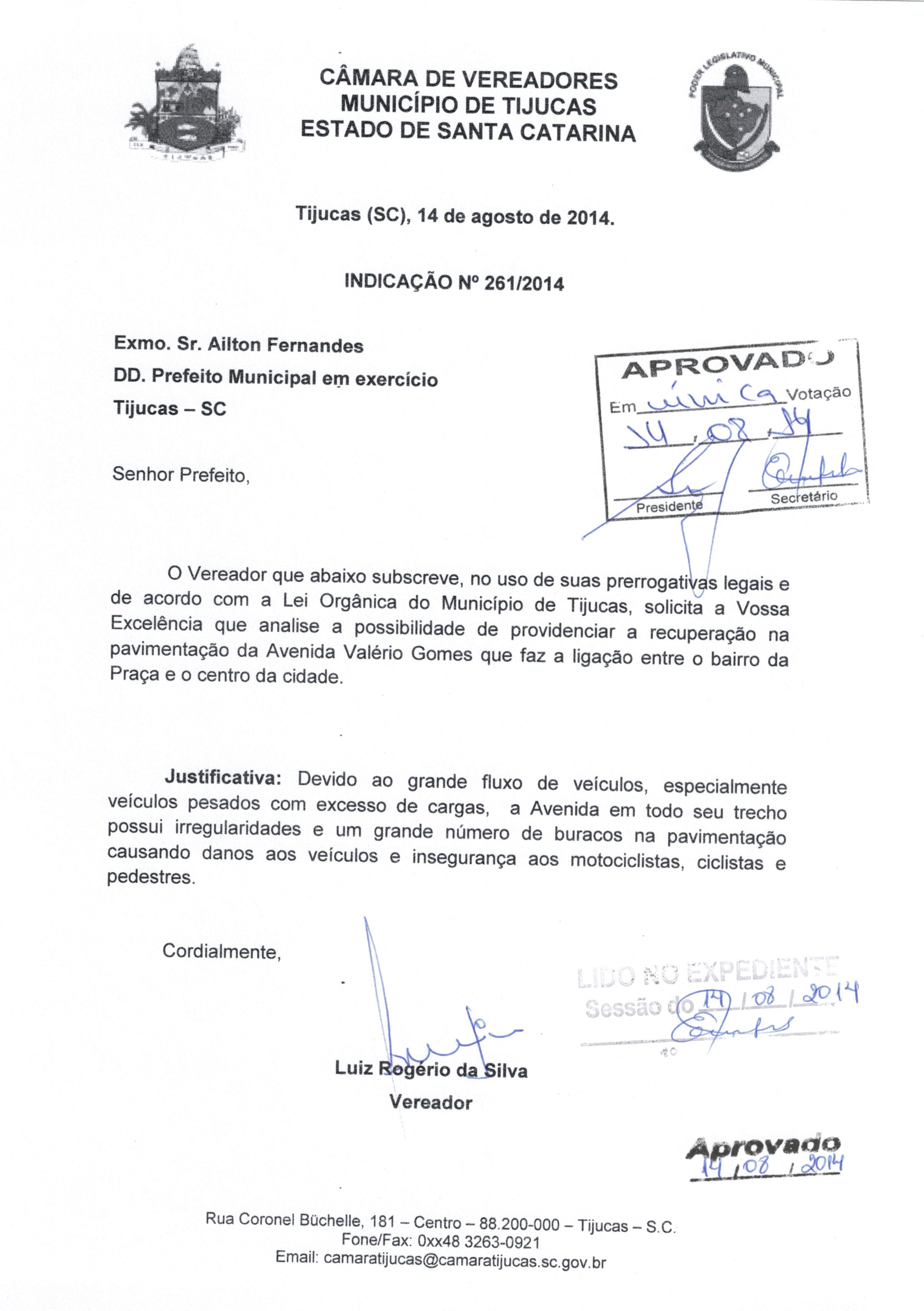 | IND. Nº 261/2014 APROVADA | Avulso | 14/08/2014 | LUIZ ROGÉRIO DA SILVA | 2609.jpeg |