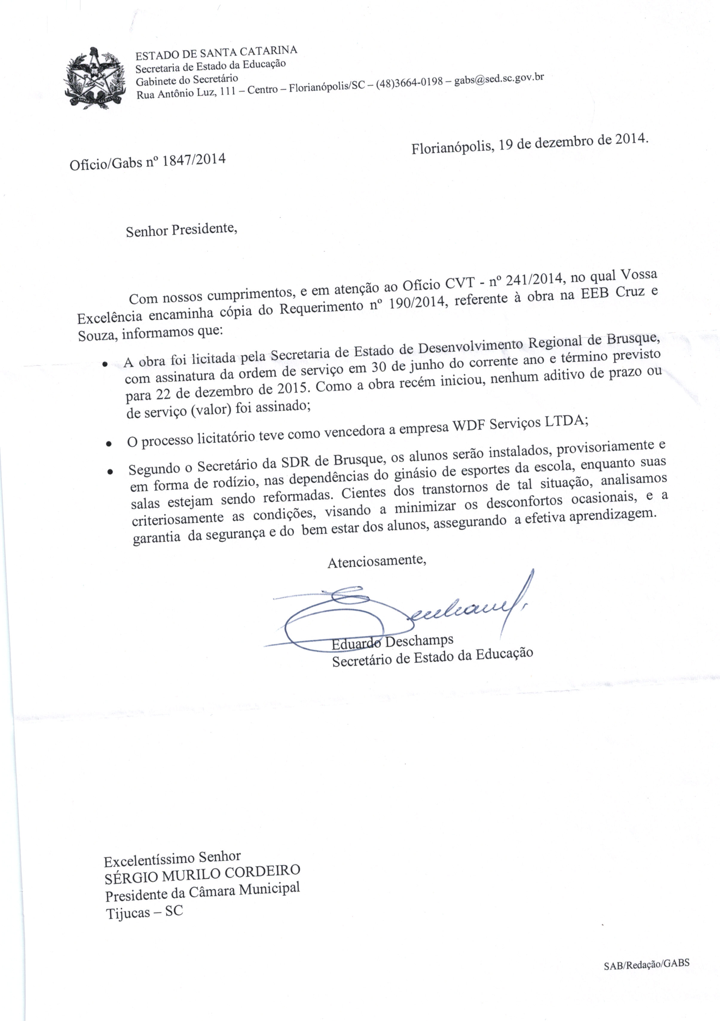 | OFÍCIO GABS Nº 1847/2014 | Ofício | 12/01/2015 | EDUARDO DESCHAMPS | 3163.jpeg |