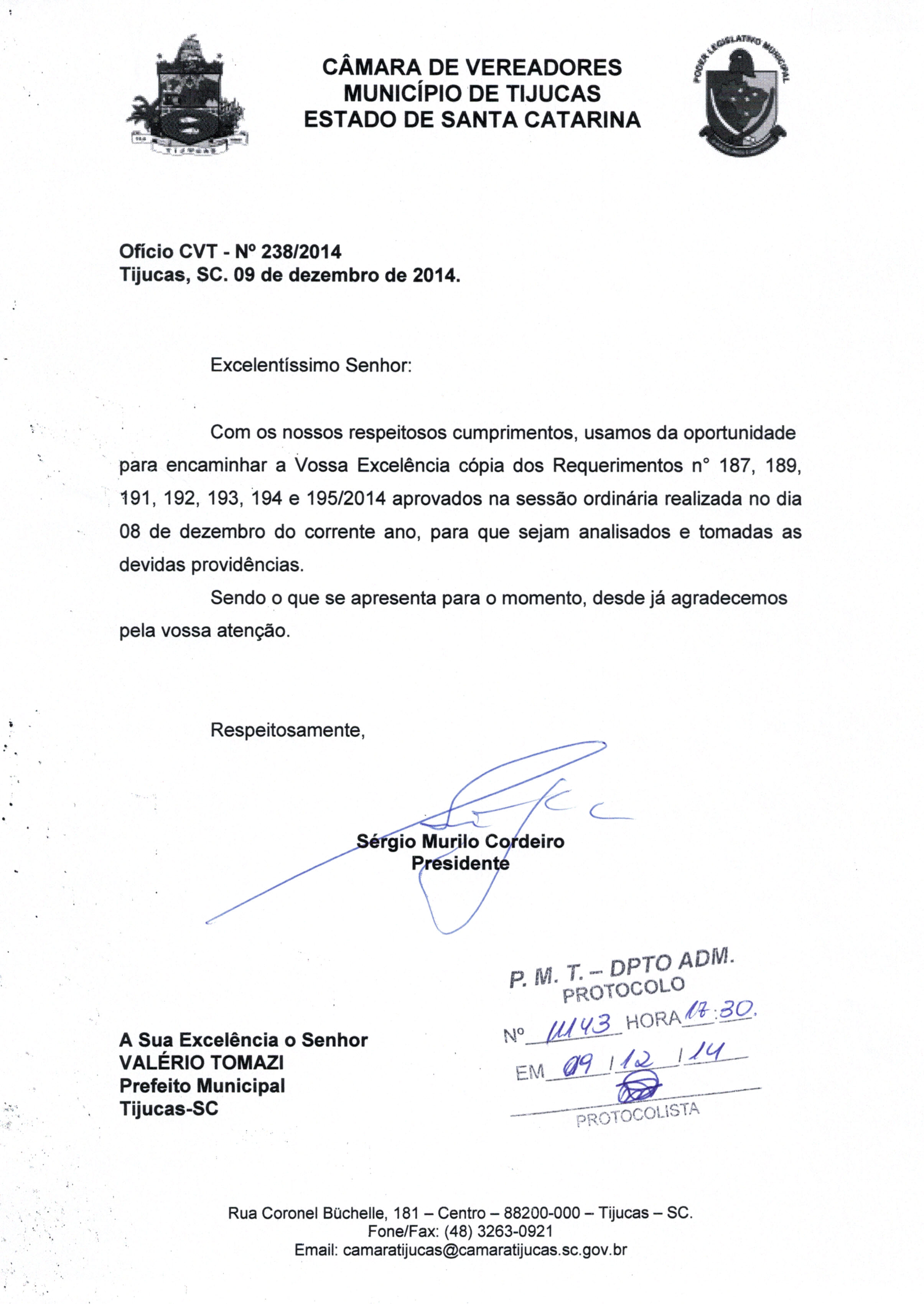 | OFÍCIO CVT Nº 238/2014 | Ofício | 09/12/2014 | SÉRGIO MURILO CORDEIRO | 3058.jpeg |
