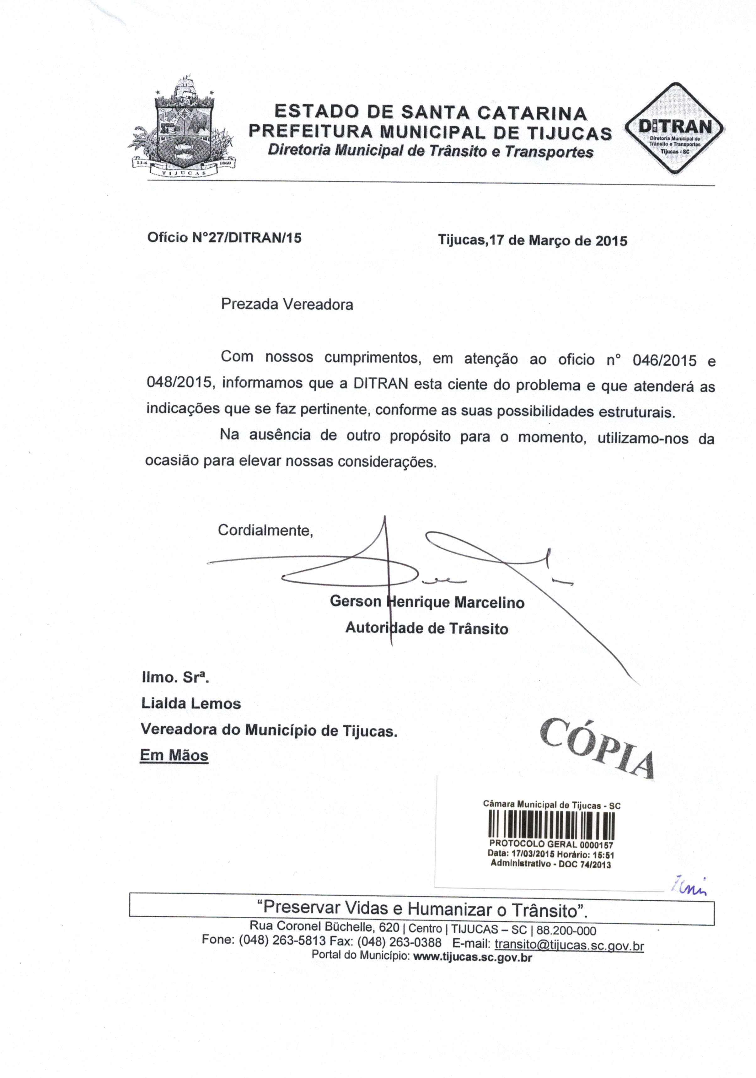 | Ofício DITRAN 27/2015 | Ofício | 17/03/2015 | GERSON HENRIQUE MARCELINO | 3338.jpeg |