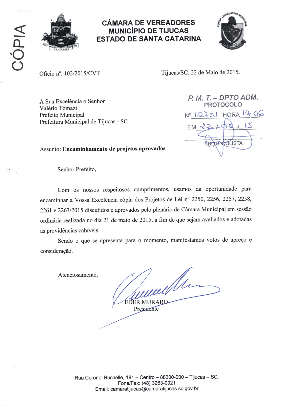 OF CVT 102/15 - ENCAMINHA PL | Ofício | 25/05/2015 | PRESIDENTE DA CÂMARA MUNICIPAL DE TIJUCAS | 3708.jpeg |