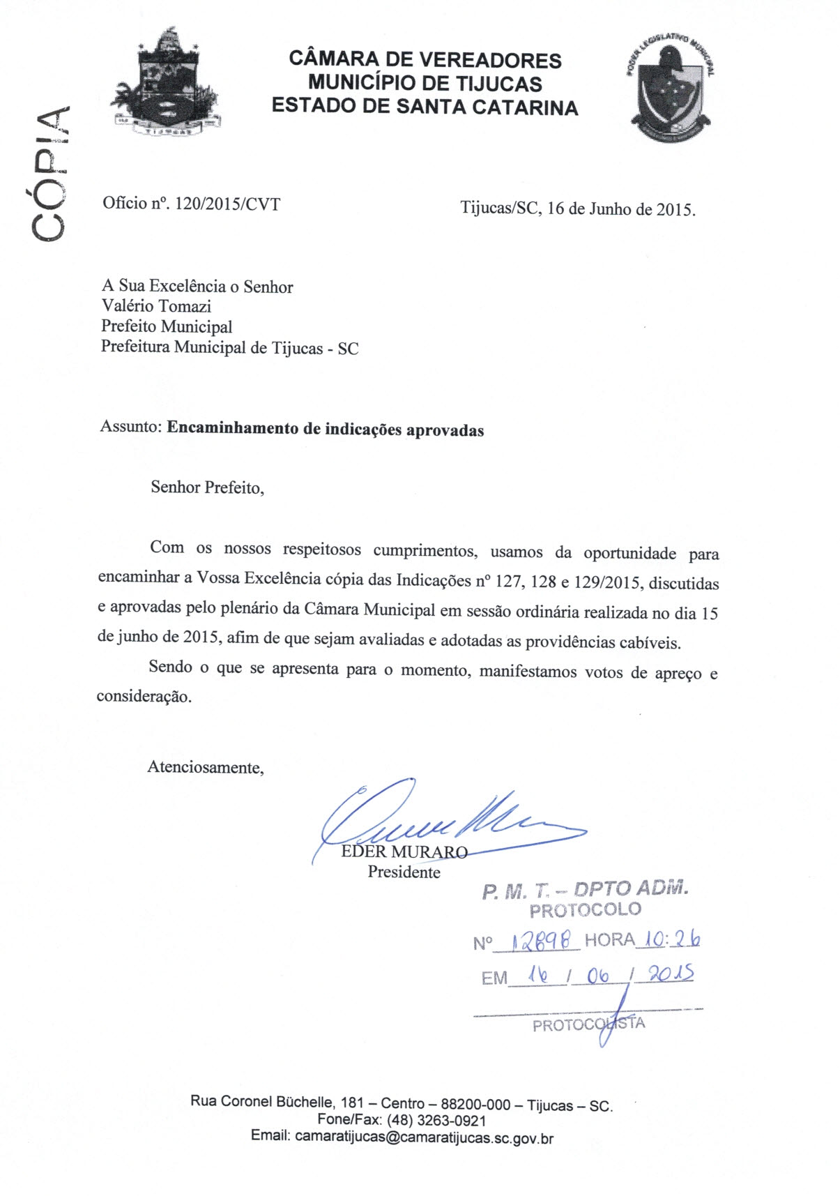 | OF CVT 120/15_ENC INDICAÇÕES | Ofício | 16/06/2015 | PRESIDENTE DA CÂMARA MUNICIPAL DE TIJUCAS | 3782.jpeg |