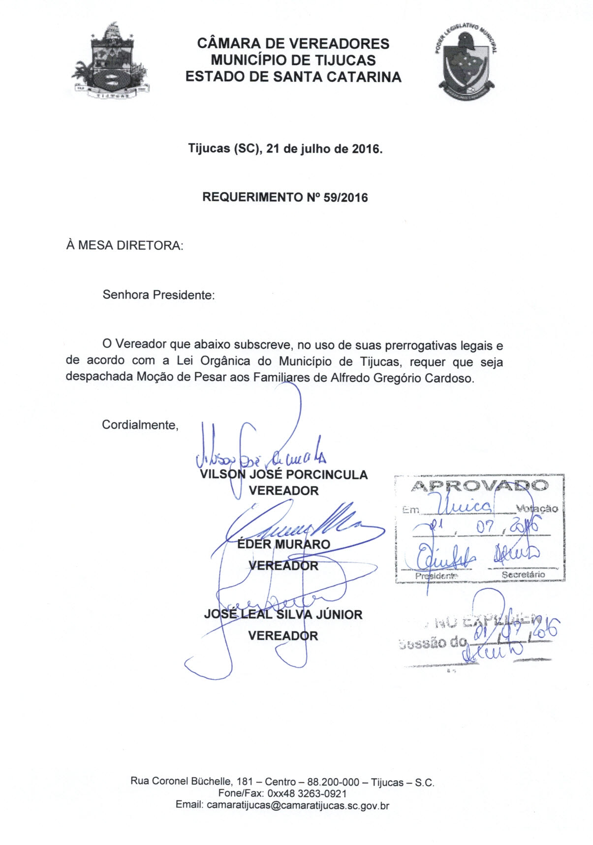 O VEREADOR QUE ABAIXO SUBSCREVE, NO USO DE SUAS PRERROGATIVAS LEGAIS E DE ACORDO COM A LEI ORGÂNICA DO MUNICÍPIO DE TIJUCAS, REQUER QUE SEJA DESPACHADA MOÇÃO DE PESAR AOS FAMILIARES DE ALFREDO GREGÓRIO CARDOSO.
