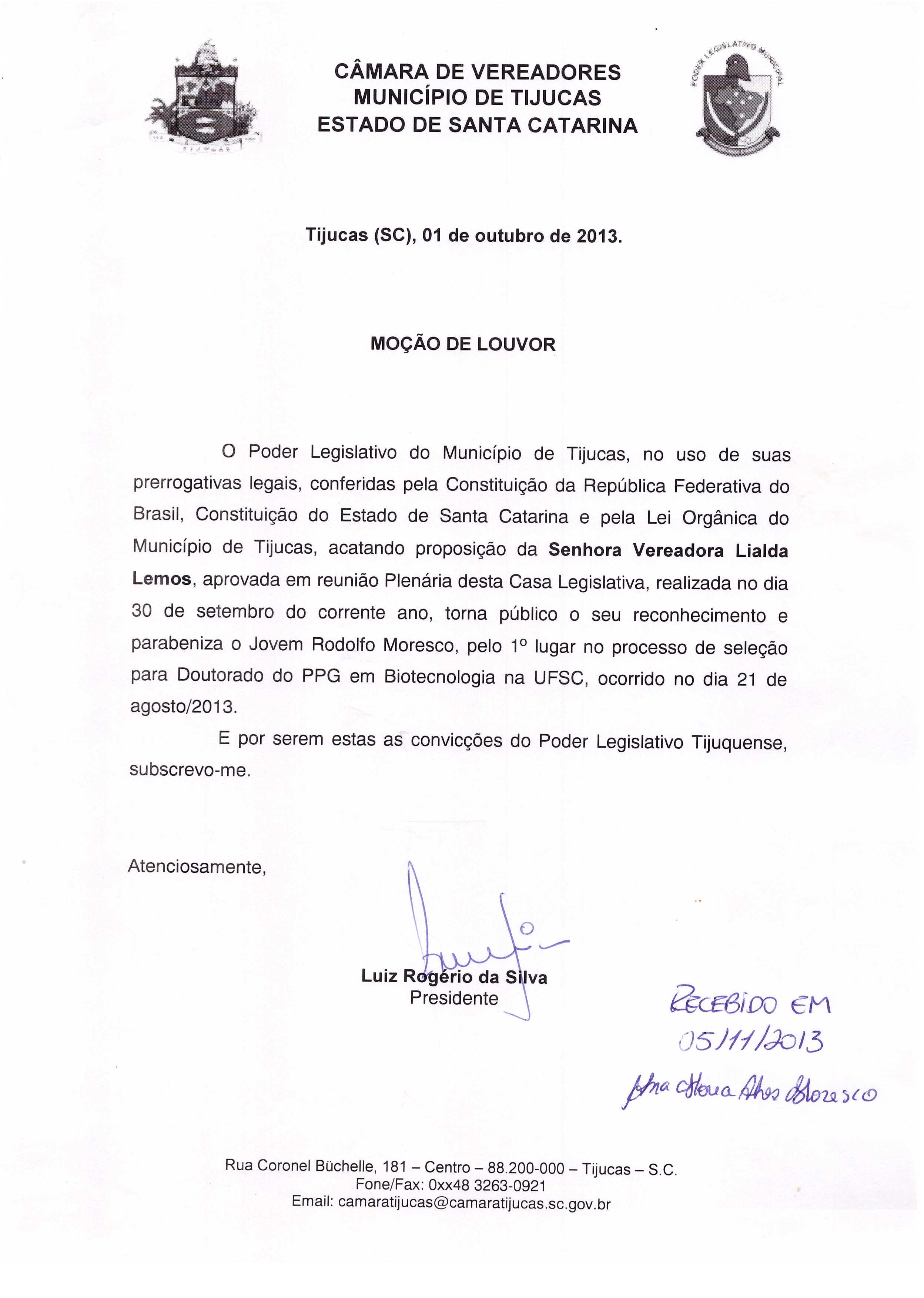 Ofício - MOÇÃO DE LOUVOR de 01/10/2013 por LUIZ ROGÉRIO DA SILVA (REQUERIMENTO nº 299 de 2013)