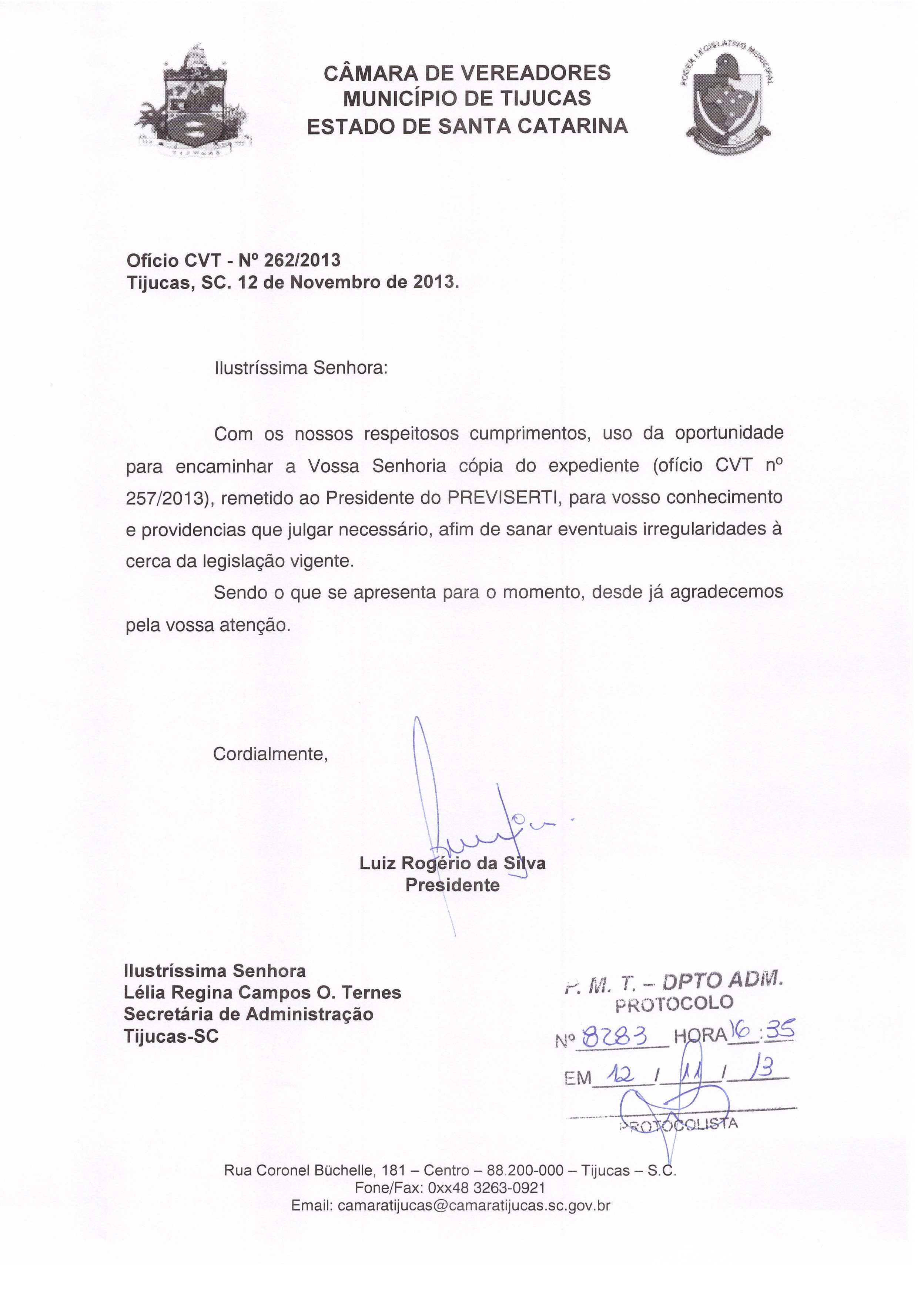 Ofício - CVT N° 262/2013 de 12/11/2013 por LUIZ ROGÉRIO DA SILVA (REQUERIMENTO nº 391 de 2013)