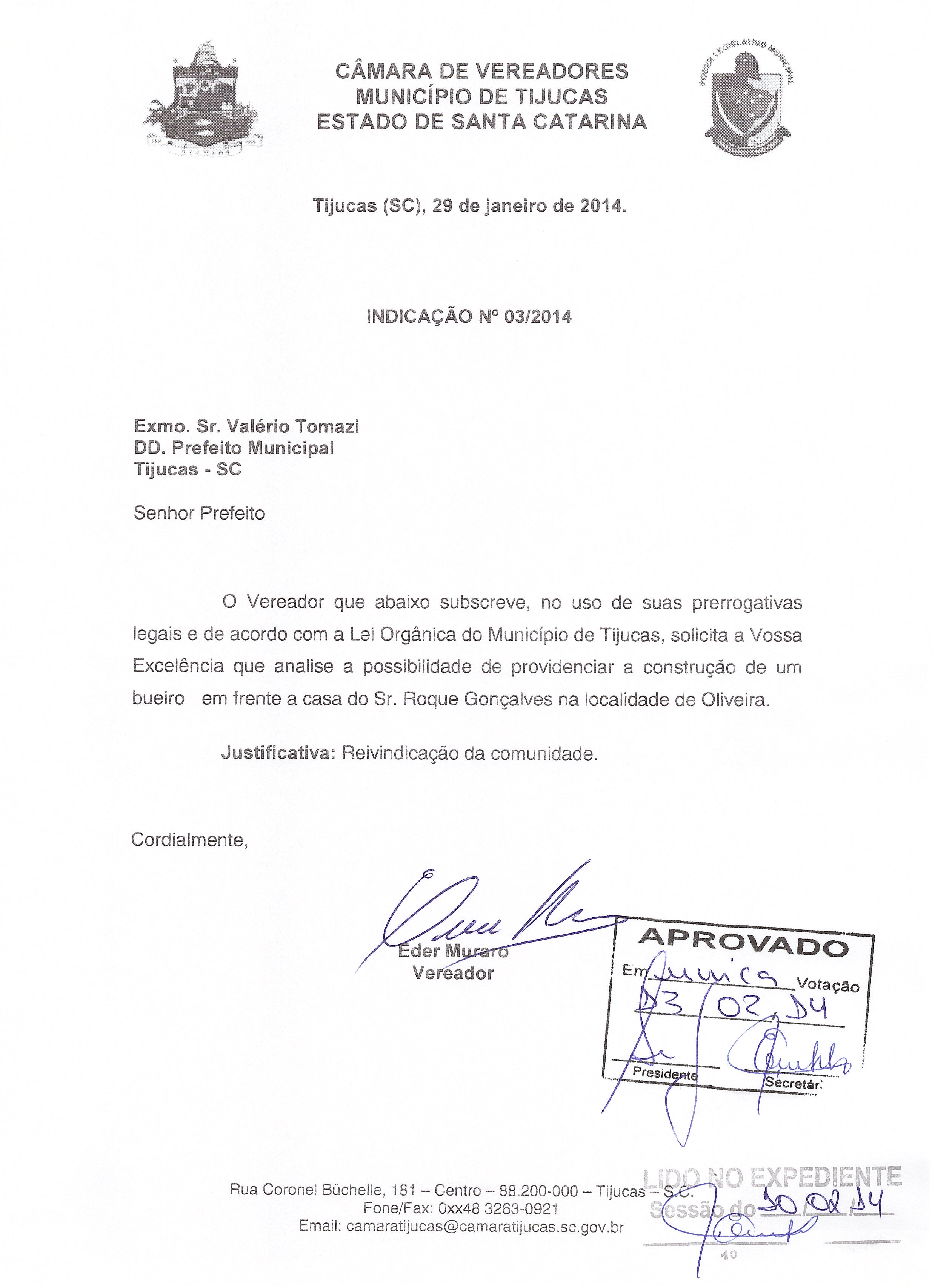Avulso - IND 03/2014 APROVADA de 14/02/2014 por EDER MURARO (INDICAÇÃO nº 3 de 2014)