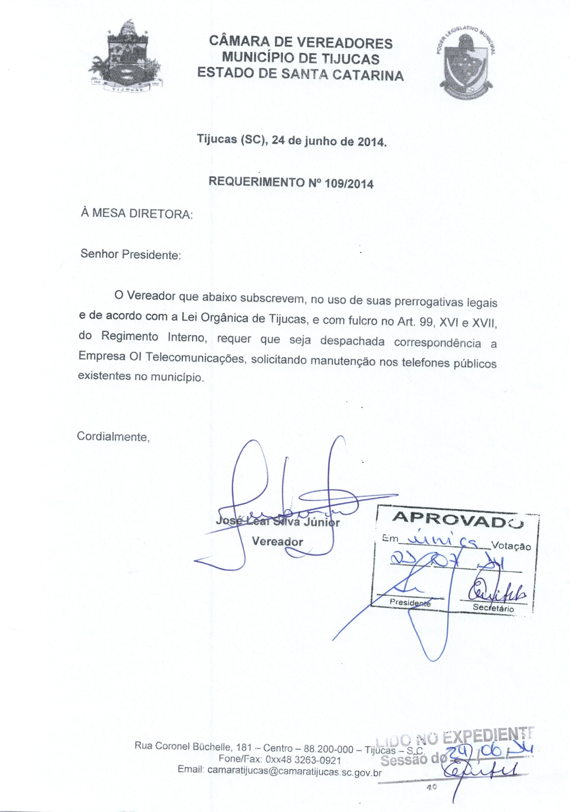 Avulso - REQ. Nº 109/2014 APROVADO de 21/07/2014 por JOSÉ LEAL SILVA JÚNIOR (REQUERIMENTO nº 109 de 2014)