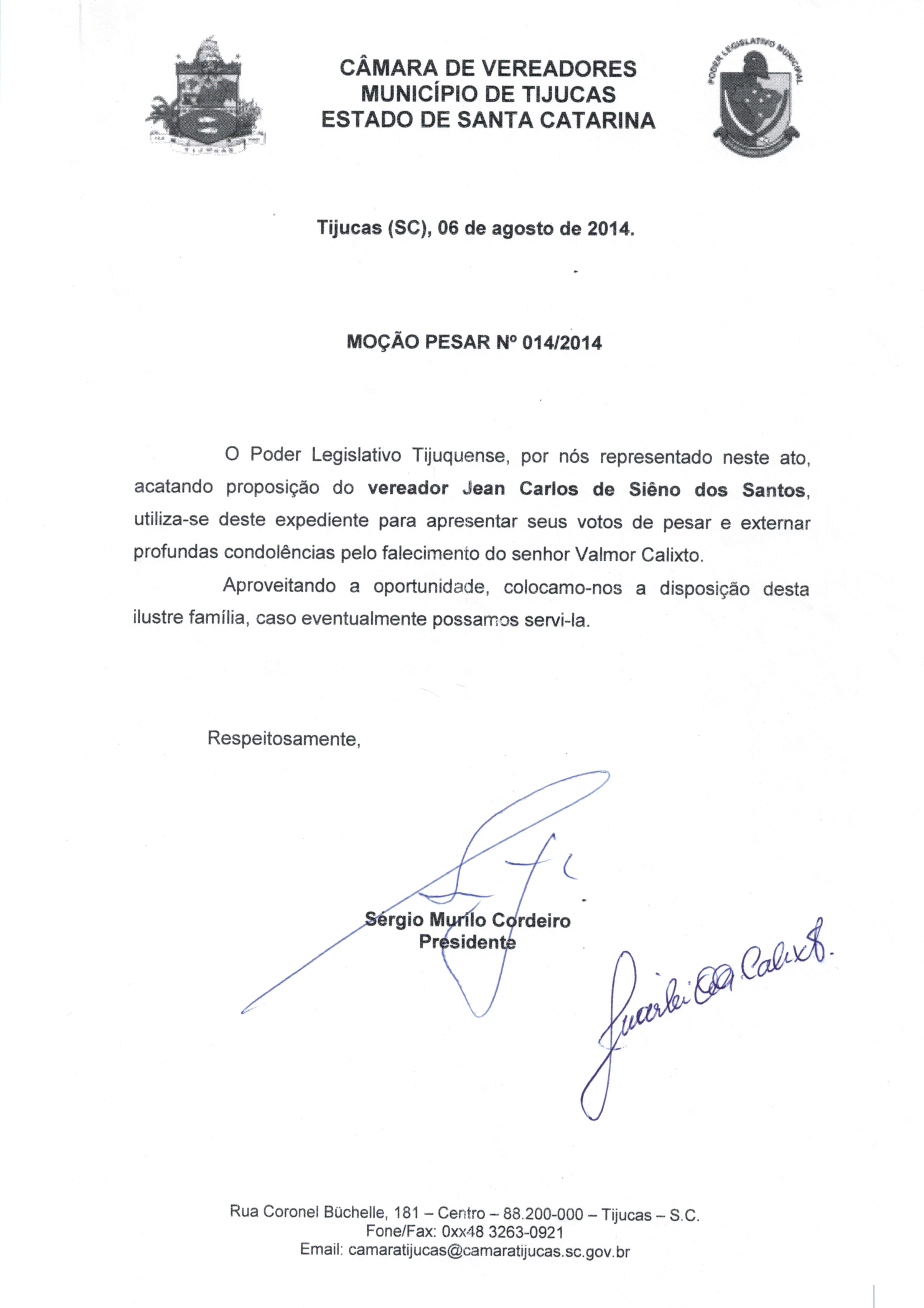 Avulso - MOÇÃO PESAR Nº 014/2014 de 28/08/2014 por SERGIO MURILO CORDEIRO (MOÇÕES DE APLAUSOS/APELO/PESAR/PROTESTO nº 14 de 2014)
