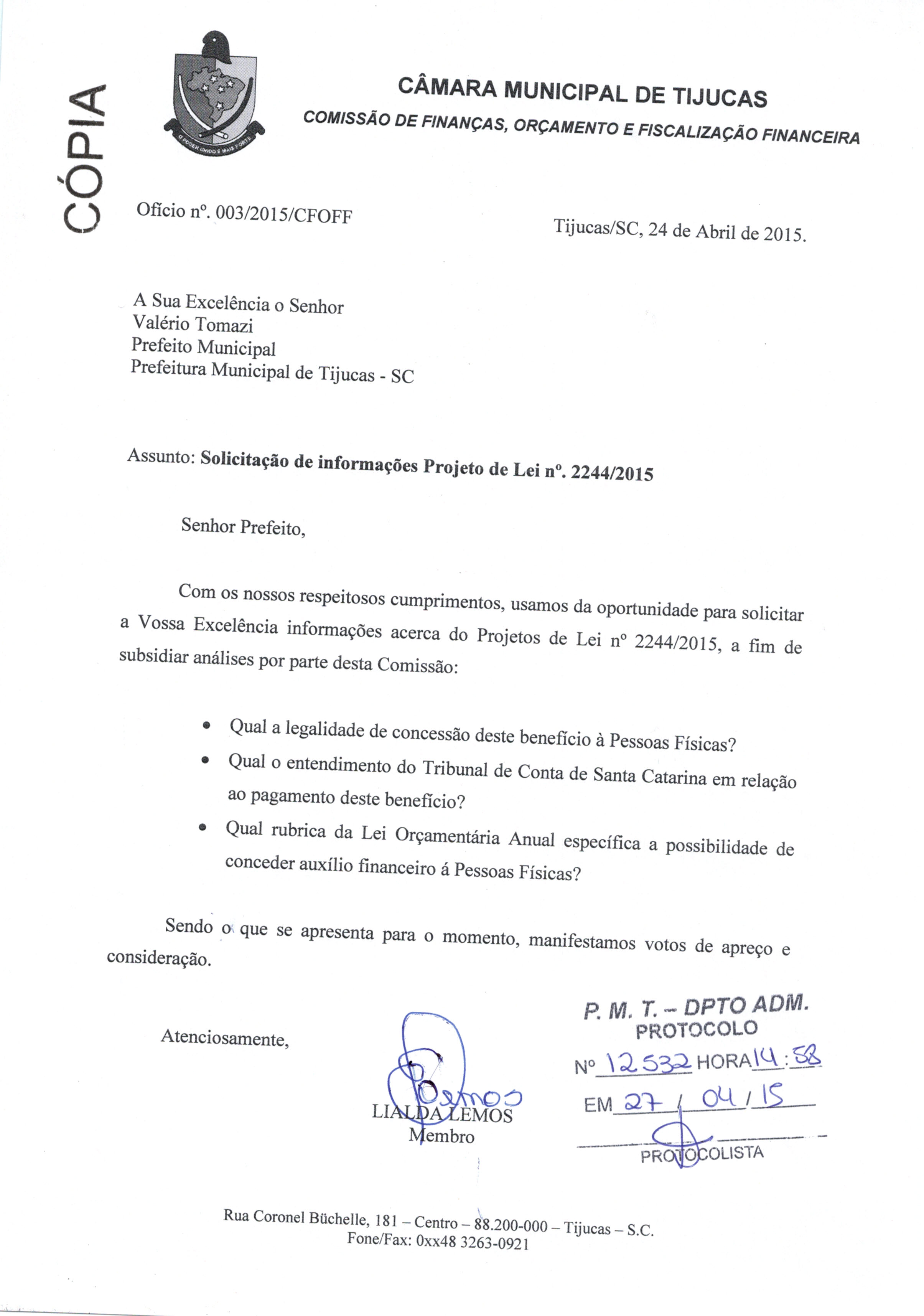 Ofício - OF CFOFF 03/2015 de 24/04/2015 por CFOFF - MEMBRO LIALDA LEMOS (PROJETO DE LEI - EXECUTIVO nº 2244 de 2015)