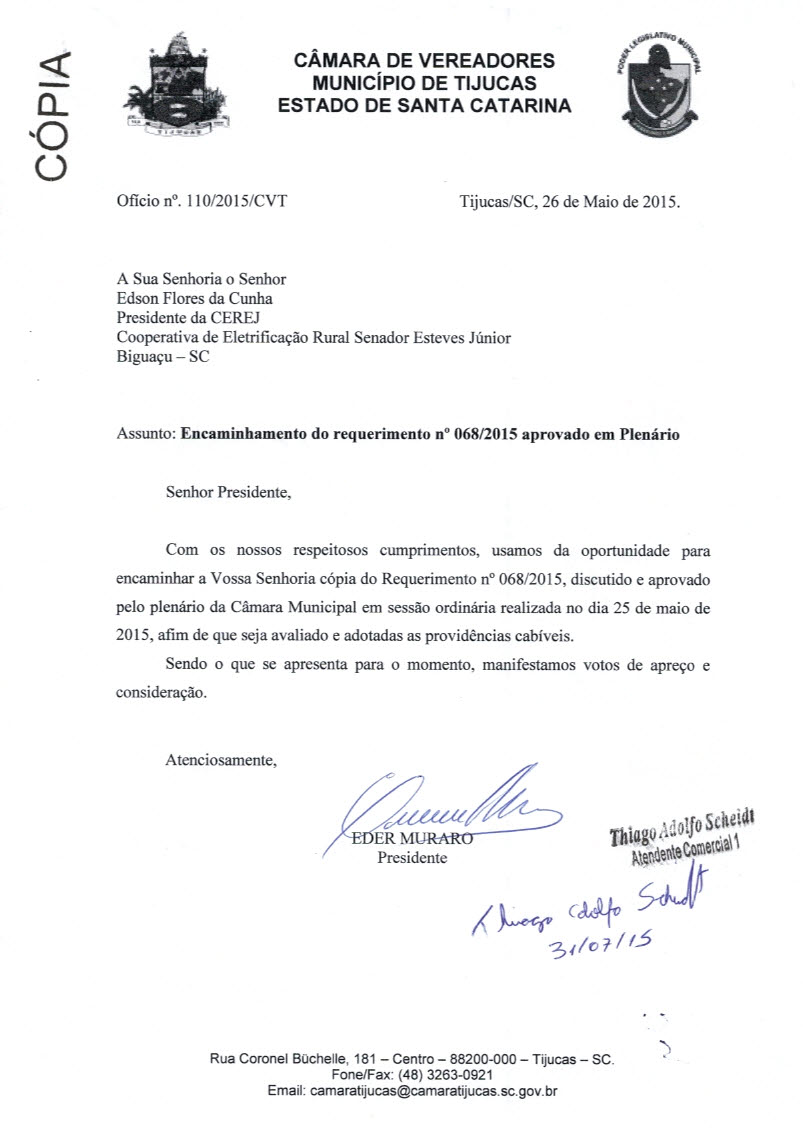 Ofício - OFÍCIO CVT 110/2015 de 31/07/2015 por Eder Muraro (REQUERIMENTO nº 68 de 2015)