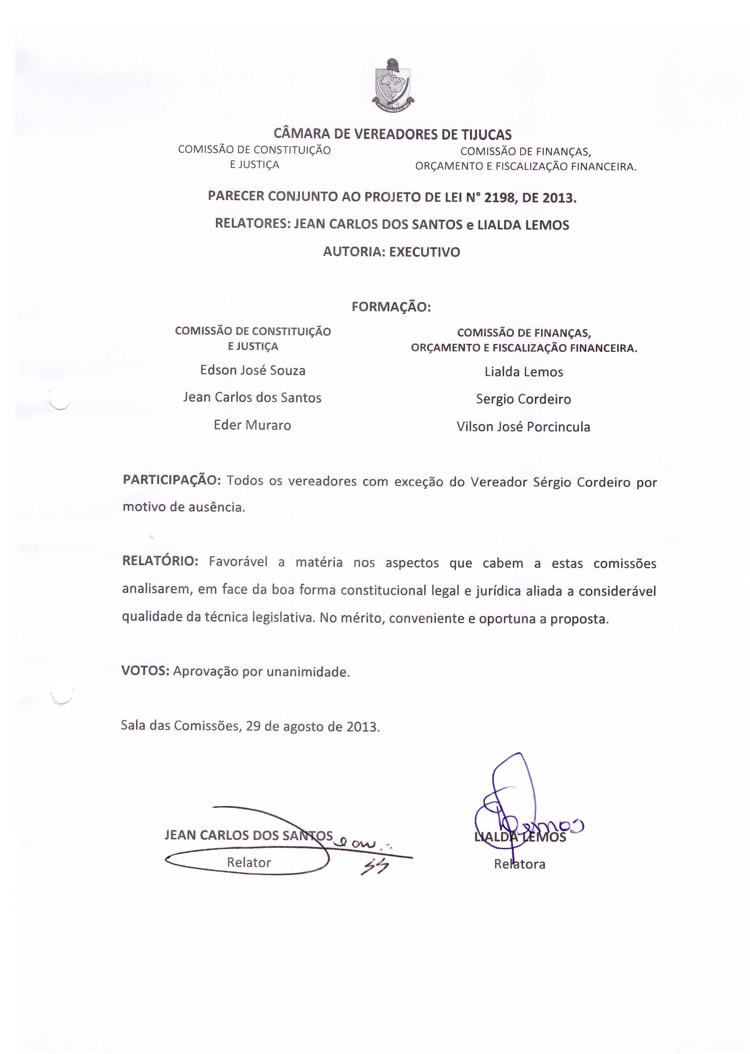Parecer - PROJETO DE LEI N° 2198/2013 de 30/08/2013 por Jean Carlos dos Santos e Lialda Lemos (PROJETO DE LEI - EXECUTIVO nº 2198 de 2013)