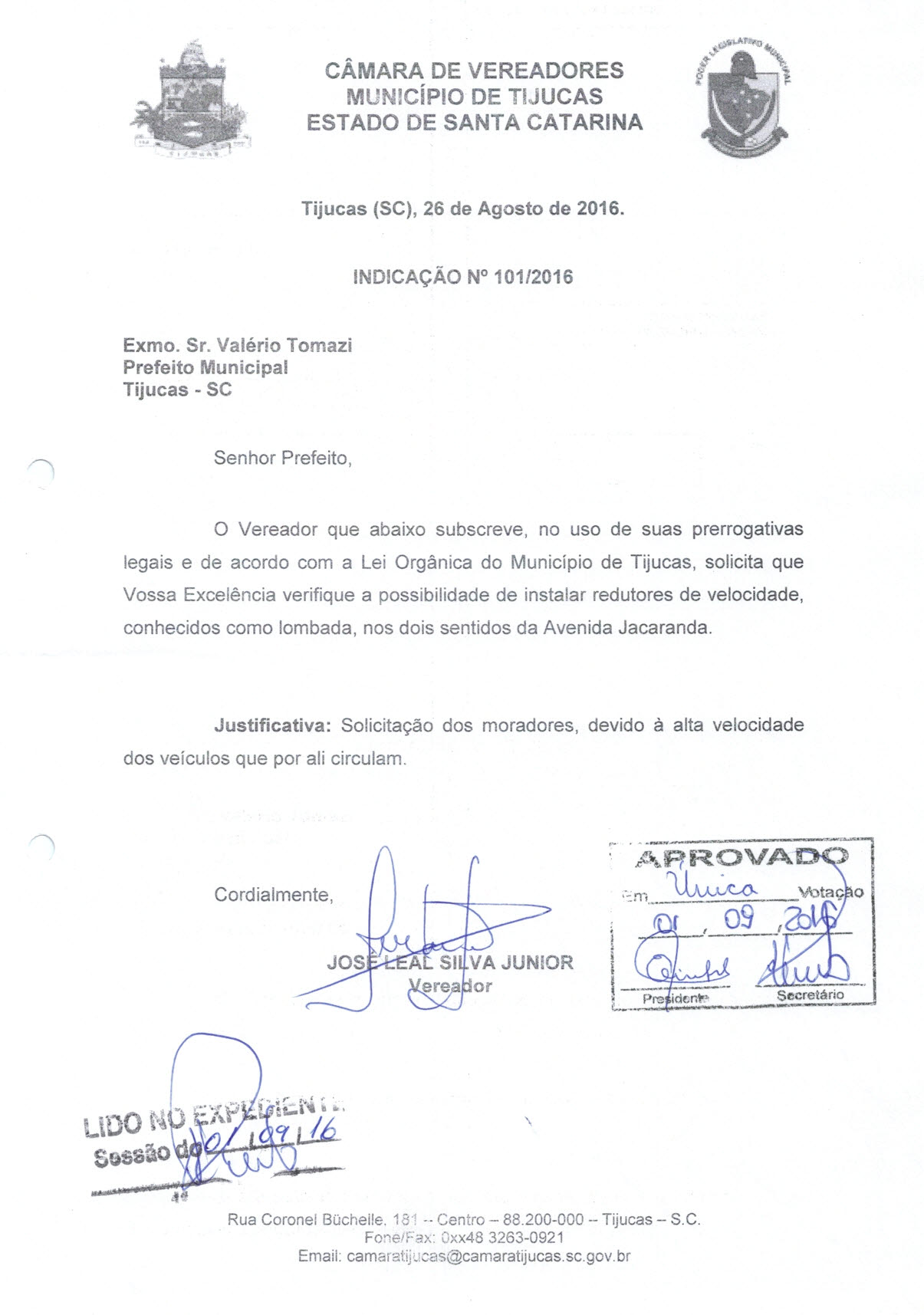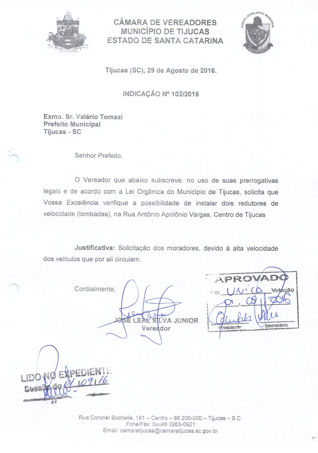 E, POR SEREM ESTAS AS CONVICÇÕES DO PODER LEGISLATIVO DE TIJUCAS, SUBSCREVO-ME.