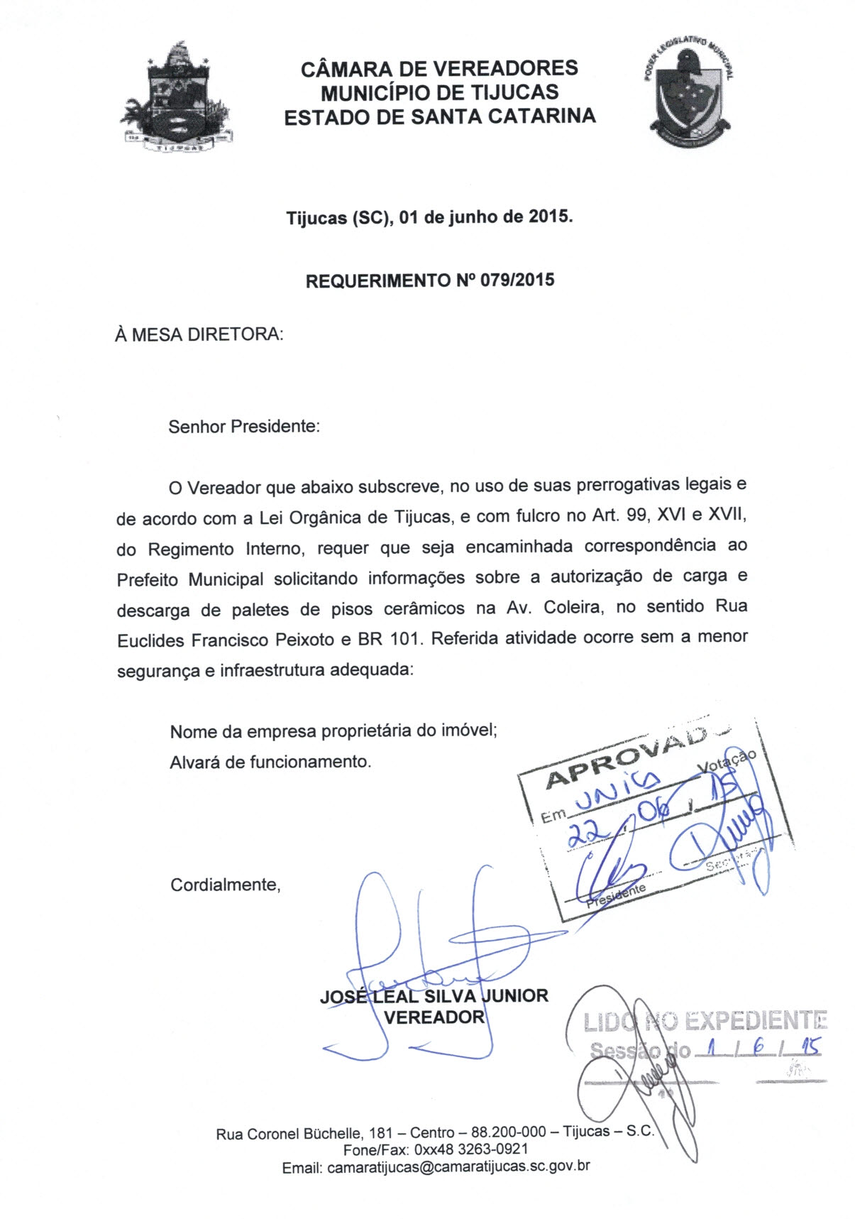 REQUERIMENTO Nº 079/2015 À MESA DIRETORA: SENHOR PRESIDENTE: O VEREADOR QUE ABAIXO SUBSCREVE, NO USO DE SUAS PRERROGATIVAS LEGAIS E DE ACORDO COM A LEI ORGÂNICA DE TIJUCAS, E COM FULCRO NO ART. 99, XVI E XVII, DO REGIMENTO INTERNO, REQUER QUE SEJA ENCAMINHADA CORRESPONDÊNCIA AO PREFEITO MUNICIPAL SOLICITANDO INFORMAÇÕES SOBRE A AUTORIZAÇÃO DE CARGA E DESCARGA DE PALETES DE PISOS CERÂMICOS NA AV. COLEIRA, NO SENTIDO RUA EUCLIDES FRANCISCO PEIXOTO E BR 101. REFERIDA ATIVIDADE OCORRE SEM A MENOR SEGURANÇA E INFRAESTRUTURA ADEQUADA: NOME DA EMPRESA PROPRIETÁRIA DO IMÓVEL; ALVARÁ DE FUNCIONAMENTO. CORDIALMENTE, JOSÉ LEAL SILVA JUNIOR VEREADOR - TIJUCAS (SC), 01 DE JUNHO DE 2015. REQUERIMENTO Nº 079/2015 À MESA DIRETORA: SENHOR PRESIDENTE: O VEREADOR QUE ABAIXO SUBSCREVE, NO USO DE SUAS PRERROGATIVAS LEGAIS E DE ACORDO COM A LEI ORGÂNICA DE TIJUCAS, E COM FULCRO NO ART. 99, XVI E XVII, DO REGIMENTO INTERNO, REQUER QUE SEJA ENCAMINHADA CORRESPONDÊNCIA AO PREFEITO MUNICIPAL SOLICITANDO INFORMAÇÕES SOBRE A AUTORIZAÇÃO DE CARGA E DESCARGA DE PALETES DE PISOS CERÂMICOS NA AV. COLEIRA, NO SENTIDO RUA EUCLIDES FRANCISCO PEIXOTO E BR 101. REFERIDA ATIVIDADE OCORRE SEM A MENOR SEGURANÇA E INFRAESTRUTURA ADEQUADA: NOME DA EMPRESA PROPRIETÁRIA DO IMÓVEL; ALVARÁ DE FUNCIONAMENTO. CORDIALMENTE, JOSÉ LEAL SILVA JUNIOR VEREADOR |